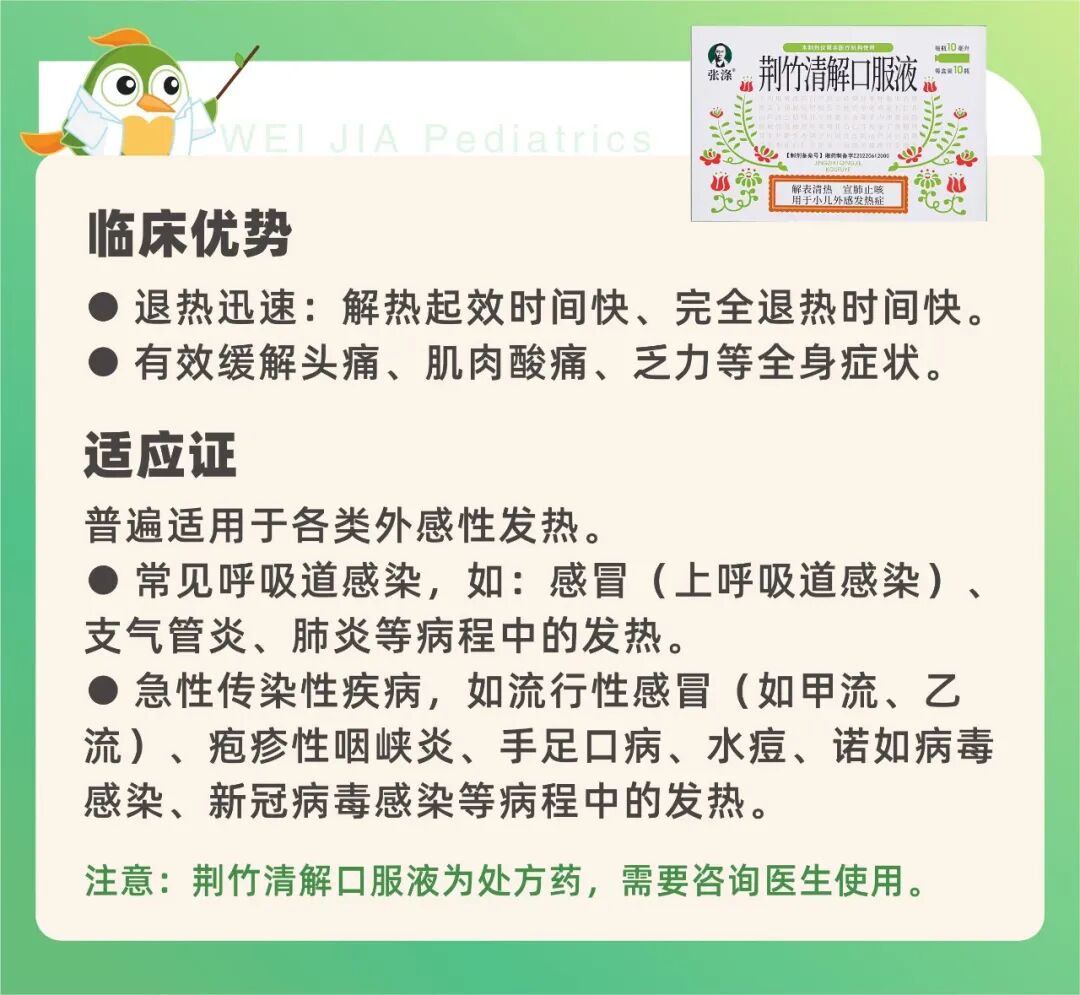 如果孩子因发热感到不适(烦躁、哭闹等),可口服荆竹清解口服液、布洛芬(6个月以上)或对乙酰氨基酚(3个月以上)缓解不适。但每2次退烧药至少要间隔4~6个小时(布洛芬需间隔6小时),24小时服用不超过4次。